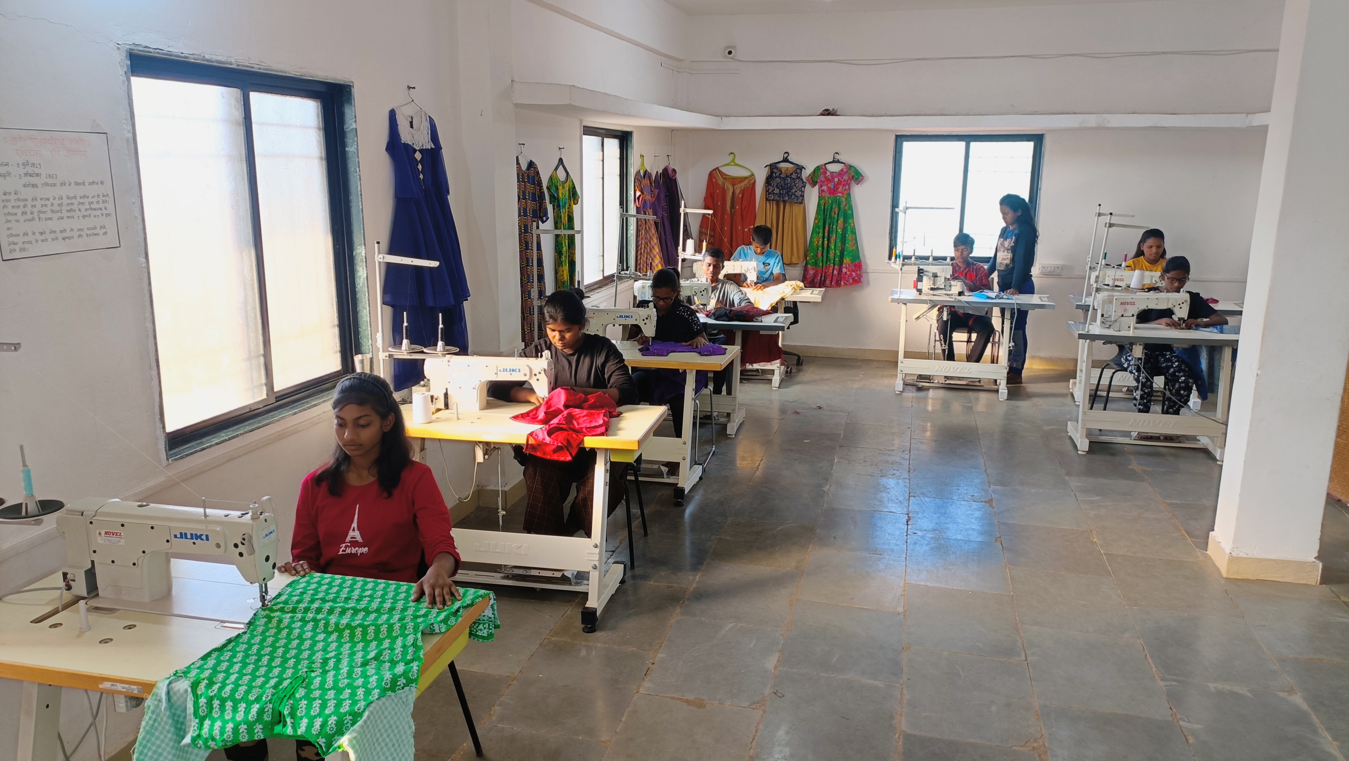 We have a sewing centre for girls where we have 8 Auto semi commercial good quality sewing machines, 1 pico fall machine and 2 Mannual sewing machines. Here our 09 girls and two boys learn stitching skills.